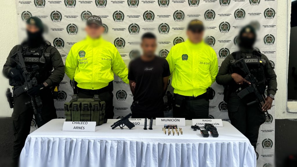 Durante el procedimiento, se efectuó la captura en flagrancia de un ciudadano a quien se le halló una pistola traumática marca RETAY, dos proveedores con 17 cartuchos, ocho cartuchos adicionales calibre 9mm, un radio de comunicación y un chaleco arnés. Estos elementos fueron incautados de inmediato como material probatorio para el proceso judicial por el delito de fabricación, tráfico y tenencia de armas de fuego o municiones.
