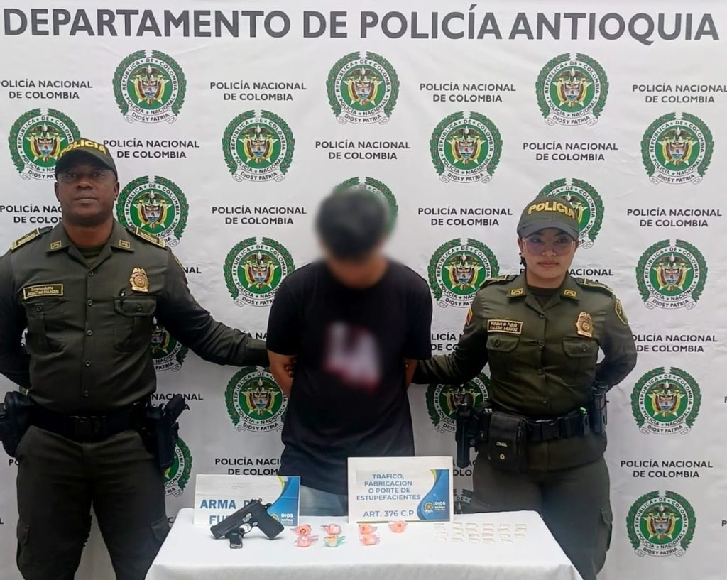 Durante la intervención policial, los uniformados hallaron en poder del capturado un arma de fuego tipo pistola calibre 9 milímetros con su respectivo proveedor, además de 23 bolsas herméticas con sustancia estupefaciente tipo bazuco y siete recipientes plásticos con sustancia, al parecer, cocaína, elementos que fueron incautados de manera inmediata.
