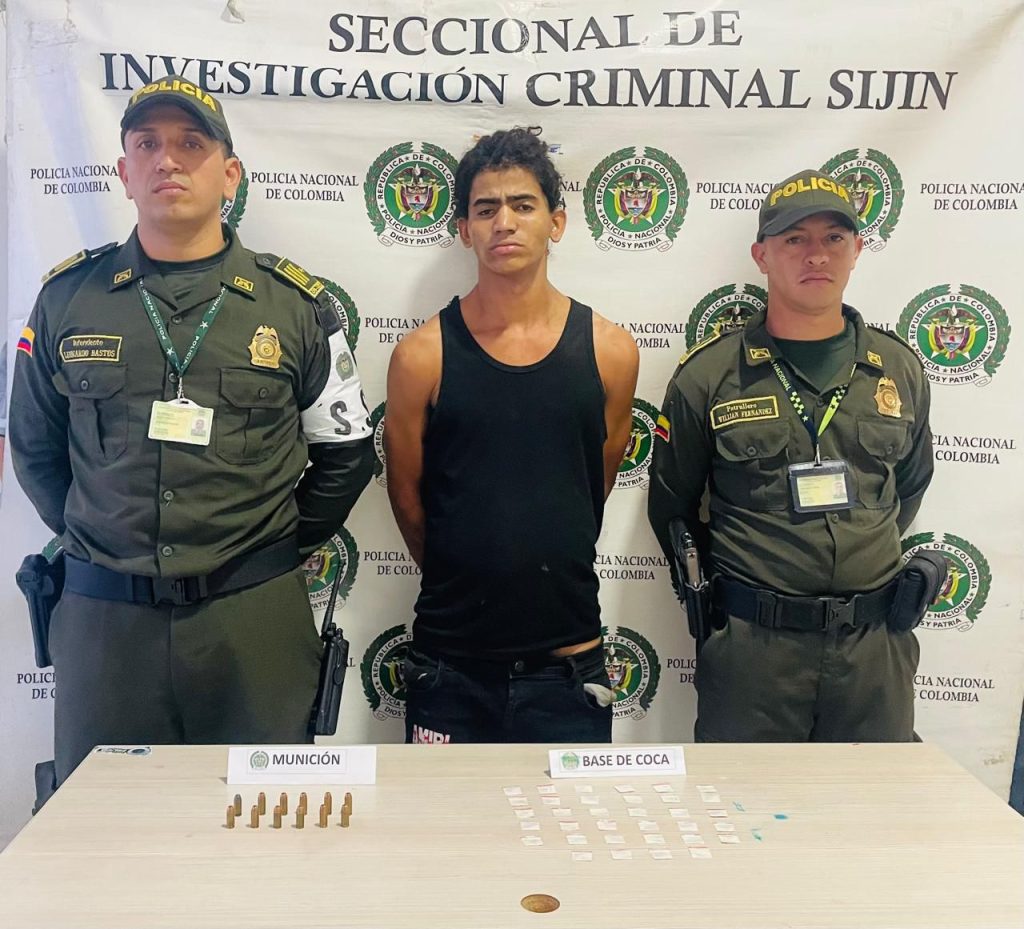 Al momento de su captura, se le hallaron más de 10 cartuchos calibre 9 milímetros y estupefacientes dosificados y listos para su comercialización.