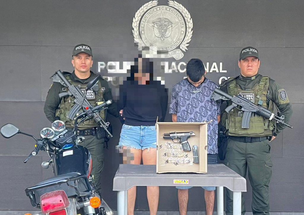 La Policía Nacional logró la captura de un hombre y una mujer en el Barrio Santo Domingo. Los detenidos portaban un arma de fuego con el serial borrado y se desplazaban en una motocicleta de alto cilindraje.