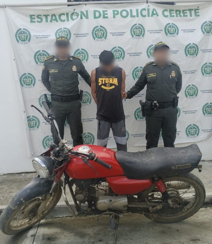 Cereté. En el marco de las acciones de control y prevención del delito que adelanta la Policía Metropolitana de Montería, fue capturada en flagrancia una persona por el delito de receptación en el barrio San Francisco, del corregimiento de Martínez, municipio de Cereté.