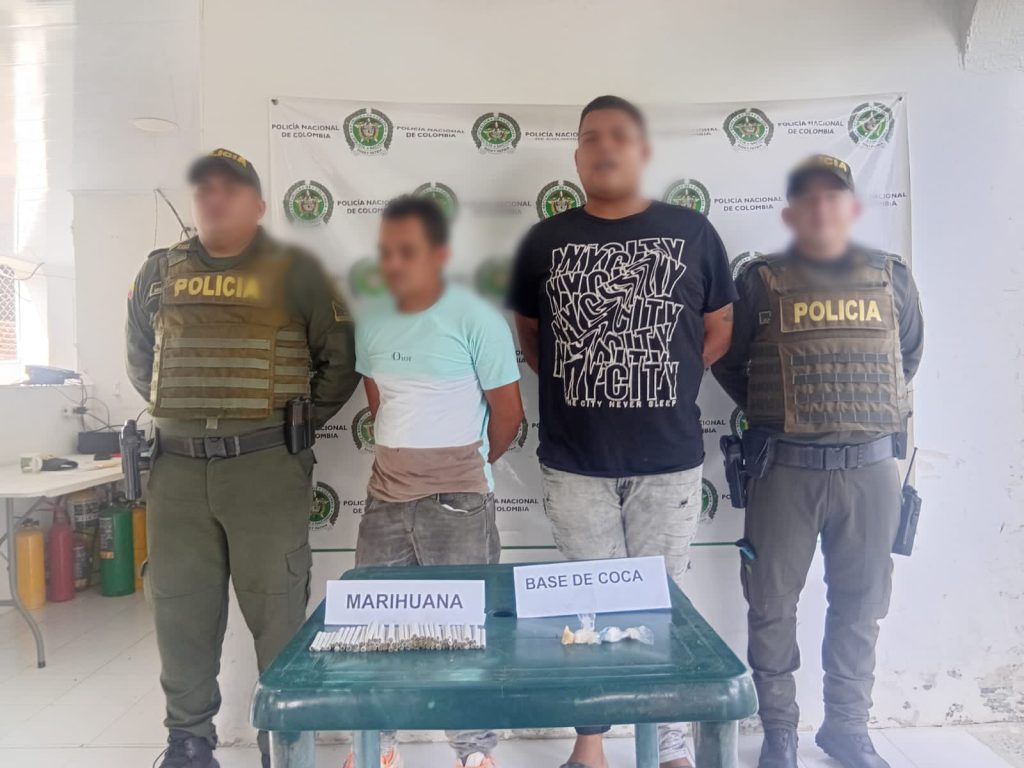 Mientras en San Pedro, fueron capturados en flagrancia Jairo Luis Hoyos Vergara, de 34 años, y Yorman David Meza Pérez, de 23 años, por el presunto delito de tráfico y porte de estupefacientes.