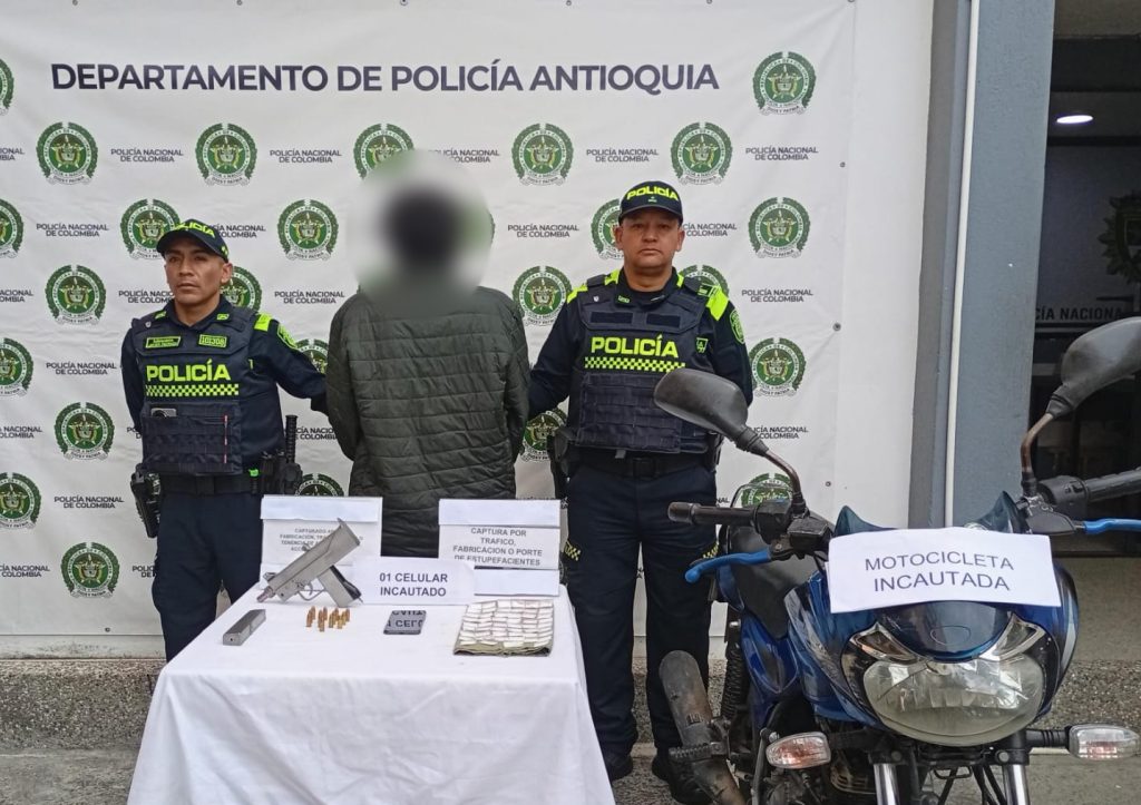 Medellín. La Policía Nacional en Antioquia, mediante unidades de la Estación de Policía Guarne, en el marco de la estrategia Actuando por Antioquia y mediante labores de patrullaje del Modelo Nacional de Vigilancia Comunitaria por Cuadrantes en Guarne, Antioquia, lograron la captura de un hombre, quien se movilizaba en una motocicleta y portaba un arma de fuego tipo subametralladora mini Uzi calibre 9 mm, con 9 cartuchos, así como 52 dosis de clorhidrato de cocaína.