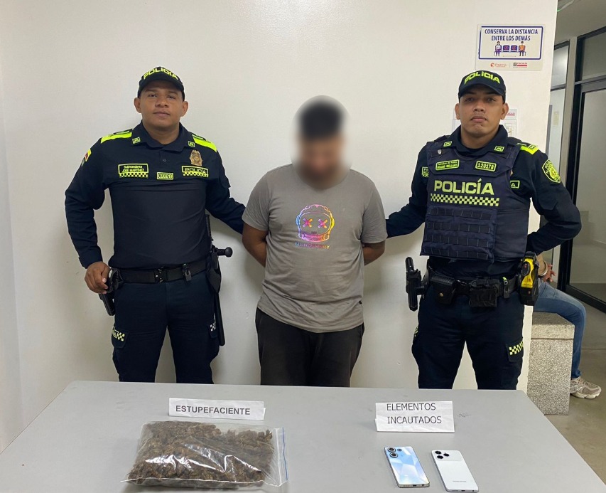 Los hechos se registraron en la transversal 50 con calle 32, sector conocido como “La Caleta de la Abuela”, donde uniformados observaron a un sujeto que, al notar la presencia policial, adoptó una actitud nerviosa, motivo por el cual se le practicó un registro a persona. Durante el procedimiento fueron hallados en su poder 611 gramos de una sustancia que se asemeja a la marihuana, así como dos teléfonos celulares, elementos que fueron incautados como material probatorio.