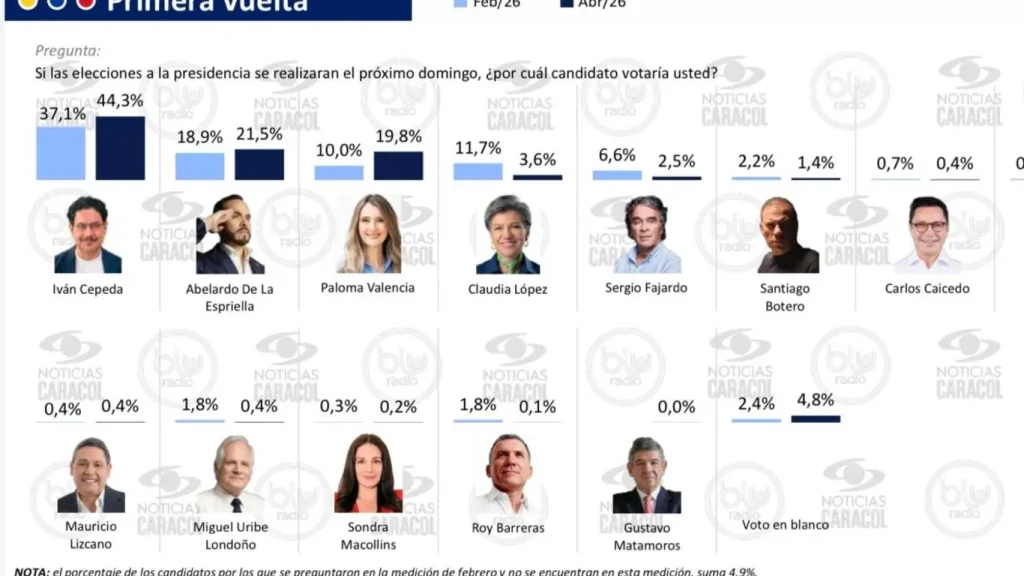 Bogotá. En un escenario aún abierto pero cada vez más tensionado, la más reciente medición de Invamer para Noticias Caracol y Blu Radio muestra un reacomodo significativo en la intención de voto de cara a una eventual primera vuelta presidencial en Colombia.